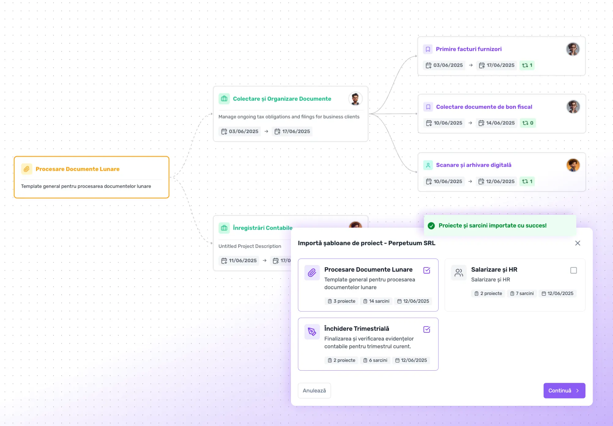 O singură platformă pentru toate sarcinile, declarațiile și termenele pentru toți clienții cabinetului.
